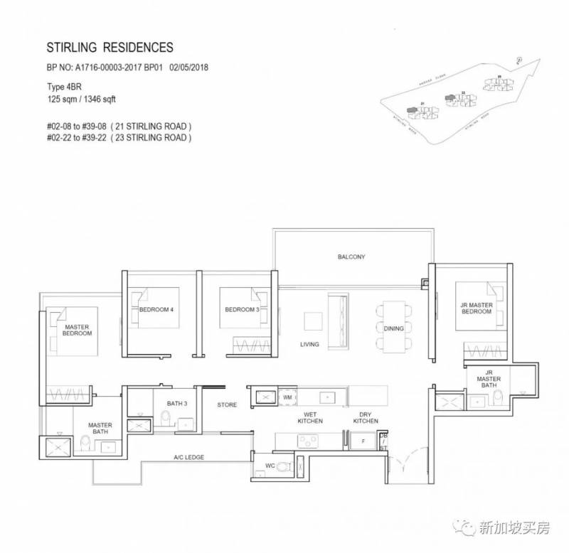4卧+储藏室,实用面积125平方米(1346平方英尺),价格233万新币起,每平方英尺价格约为1733新币。