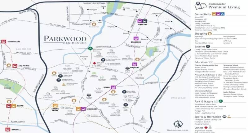 该项目距离正在建设中的实龙岗北地铁站(Serangoon North MRT)约400米。该地铁站预计将在2029年竣工,营运的将是跨岛地铁线(MRT Cross Island Line)。该地铁线也可以连接到4个地铁转换站,它们分别是光明山地铁转换站(Bright Hill MRT),宏茂桥地铁转换站(Ang Mo Kio MRT),后港地铁转换站(Hougang MRT)和巴西立地铁转换站(Pasir Ris MRT)。这个地铁站将带来项目高需求的潜力。目前距离Parkwood Residences 最近的高文地铁站(Kovan MRT),约1.2公里。该地铁站营运的是地铁东北线(MRT North East Line)。Parkwood Residences 的住户只需乘搭1个站就可以到达实龙岗地铁转换站(Serangoon MRT),那里也有营运地铁环线(MRT Circle Line)可让住户转换。Parkwood Residences的不远处也有公车站,那里有公车服务可让住户直通到杨厝港巴士总站(Yio Chu Kang bus interchange),杨厝港地铁站(Yio Chu Kang MRT)就在该巴士总站的旁边。杨厝港地铁站营运的是地铁南北线(MRT North South Line)。乘客只需往滨海湾地铁转换站(Marina Bay MRT)的方向乘搭2个站就可以抵达碧山地铁转换站(Bishan MRT)。碧山地铁转换站也是营运地铁环线的其中一个铁转换站。对驾车人士来说,从Parkwood Residences到达位于市区的中央商业区(CBD)只需约20分钟车程,而如果想到新加坡最大的购物区,乌节路逛逛,也只需Parkwood Residences的住户约15分钟的车程。Parkwood Residences旁的主要道路,杨厝港路可让住户轻易同往加冷-巴耶利峇高速公路(KPE)和中央高速公路(CTE)也为驾车人士带来方便。