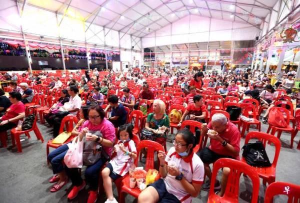 洛阳大伯公宫昨天在庙宇里举办活动,除了准备美食招待善信,也承办春节歌台助兴。受到橙色警戒影响,前来参加活动的公众远远少于之前预计的1万人。(庄耿闻摄)