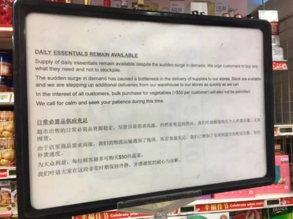 新加坡政府昨日宣布把疾病应对级别从黄色升至橙色,引致不少民众开始囤积日用品,一些架子上的货品也被抢购一空。