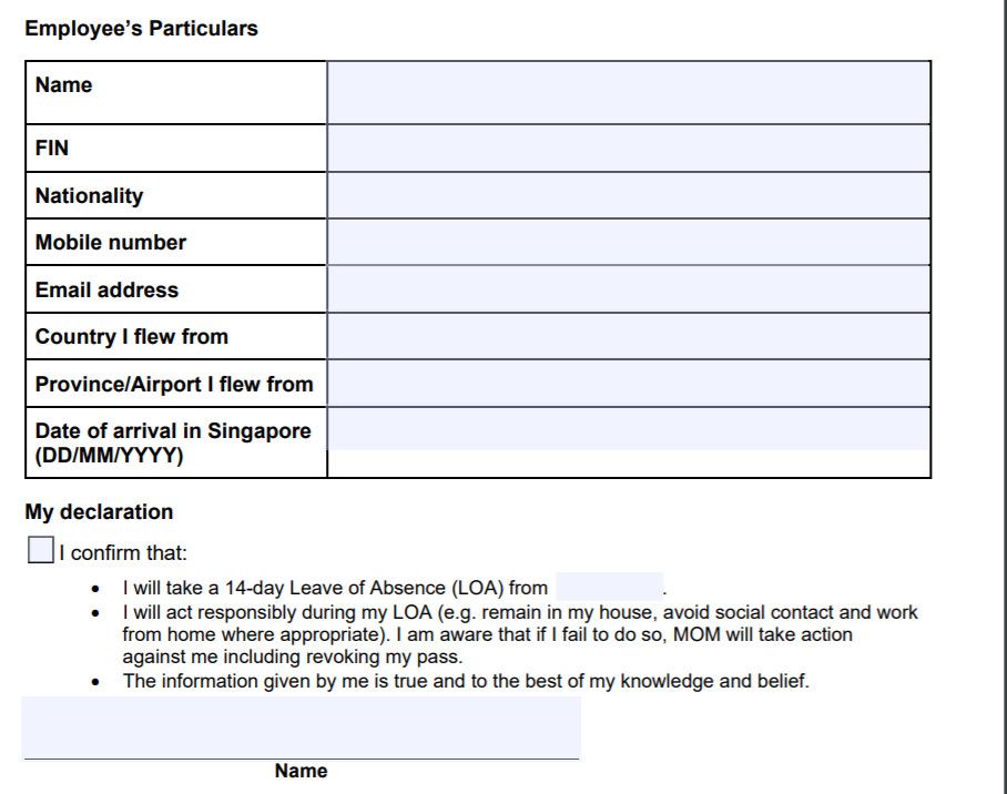 并且,这些员工需要填写缺席假反馈表格( Leave of Absence acknowledgement form )并且在入境新加坡三天之内回复人力部邮件发送表格至邮箱:[email protected]