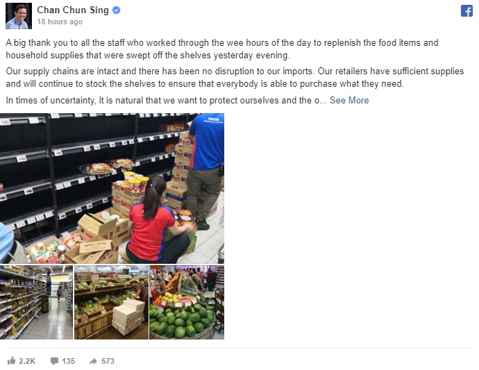 贸工部长陈振声发布面簿贴文劝请国人无需惊慌,更不必抢购食品和日用品。