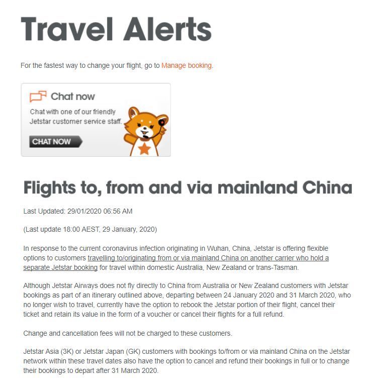 捷星航空(Jetstar)从1月31日开始暂停到中国合肥、贵阳及徐州这三个城市的航班,直到3月31日,公司之后会再评估情况。受影响的乘客会接获简讯或电邮通知,他们可以获得全额退款或是兑换礼券。另一方面,受需求下降的影响,捷星航空也宣布在3月28日之后停止飞香港的班次。