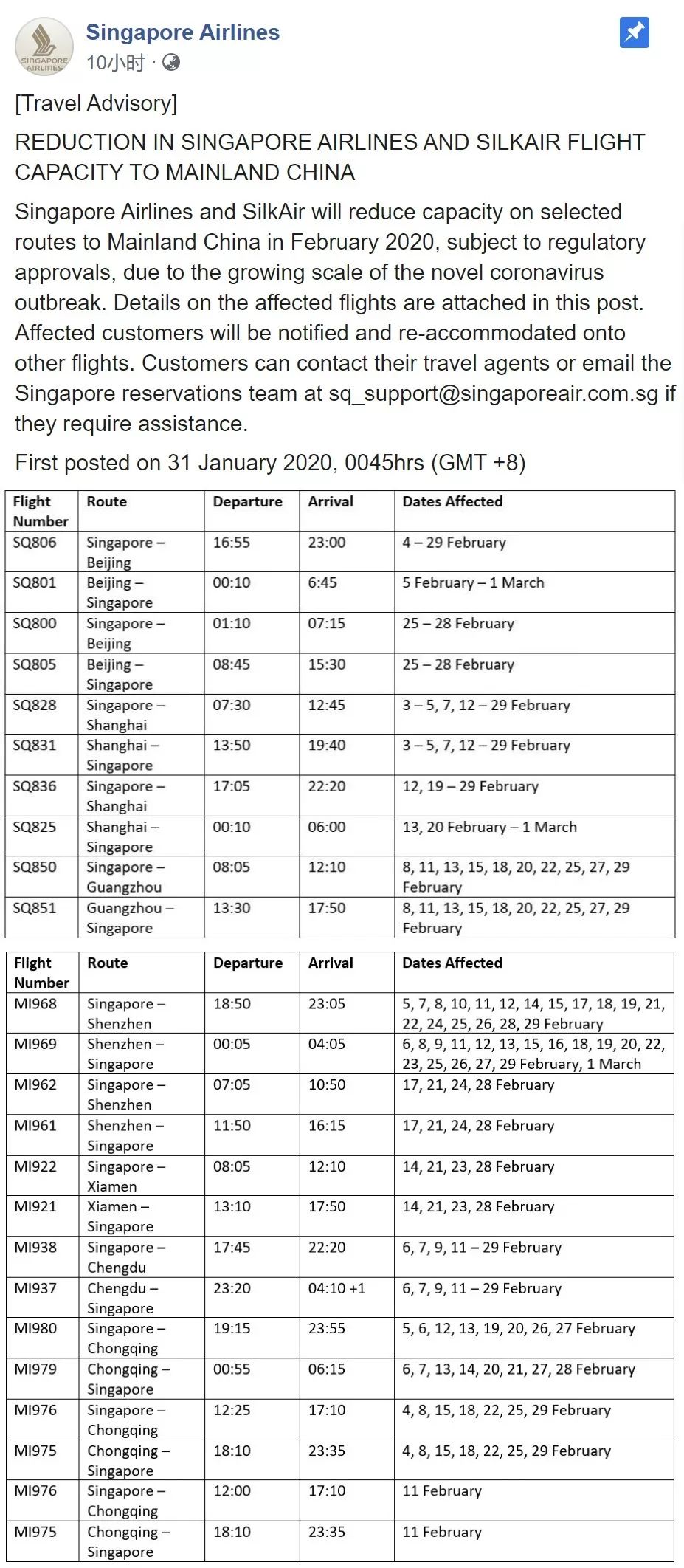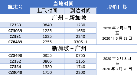 南航宣布:2月8日-3月28日期间新加坡广州航班将全部取消,2月3日起每天2班(CZ354和CZ3040)保留至2月7日。航班取消到3月28日。