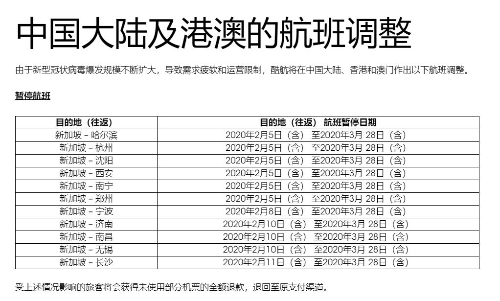 从2月份到3月份,酷航将停飞往返新加坡和中国11个城市,这些城市包括哈尔滨、杭州、沈阳、西安、南宁、郑州、宁波、济南、南昌、无锡、长沙。