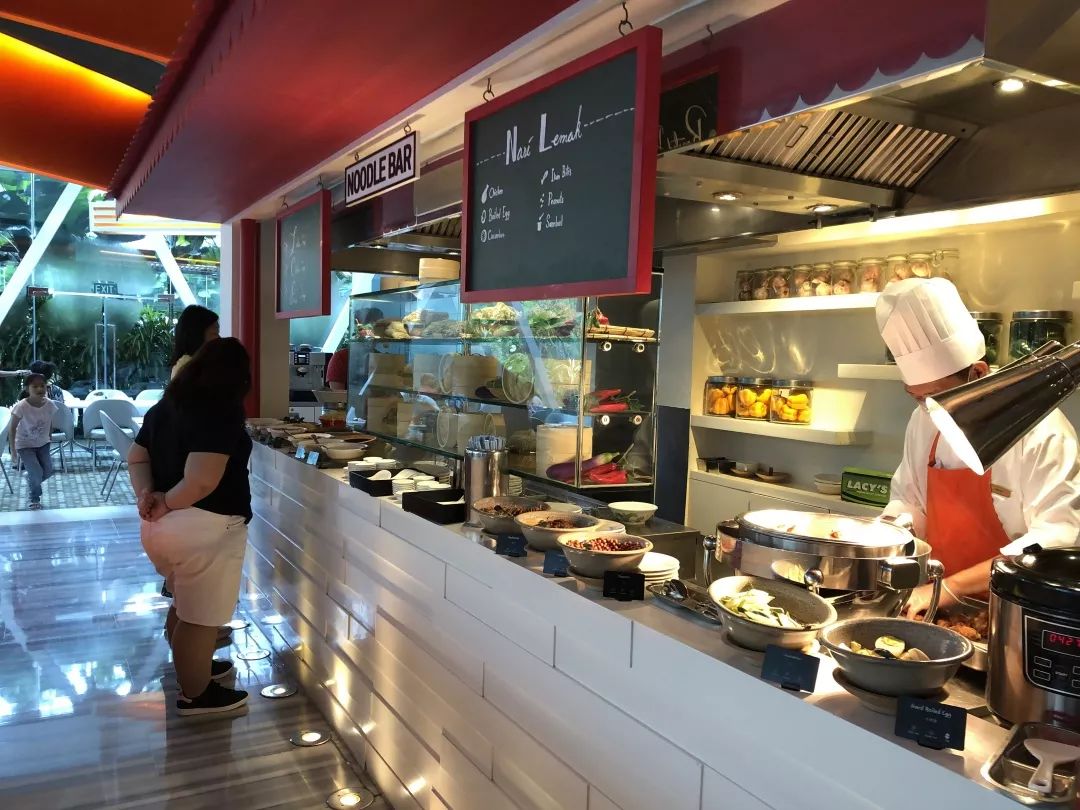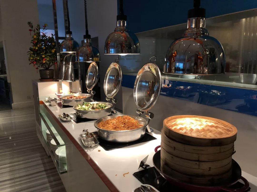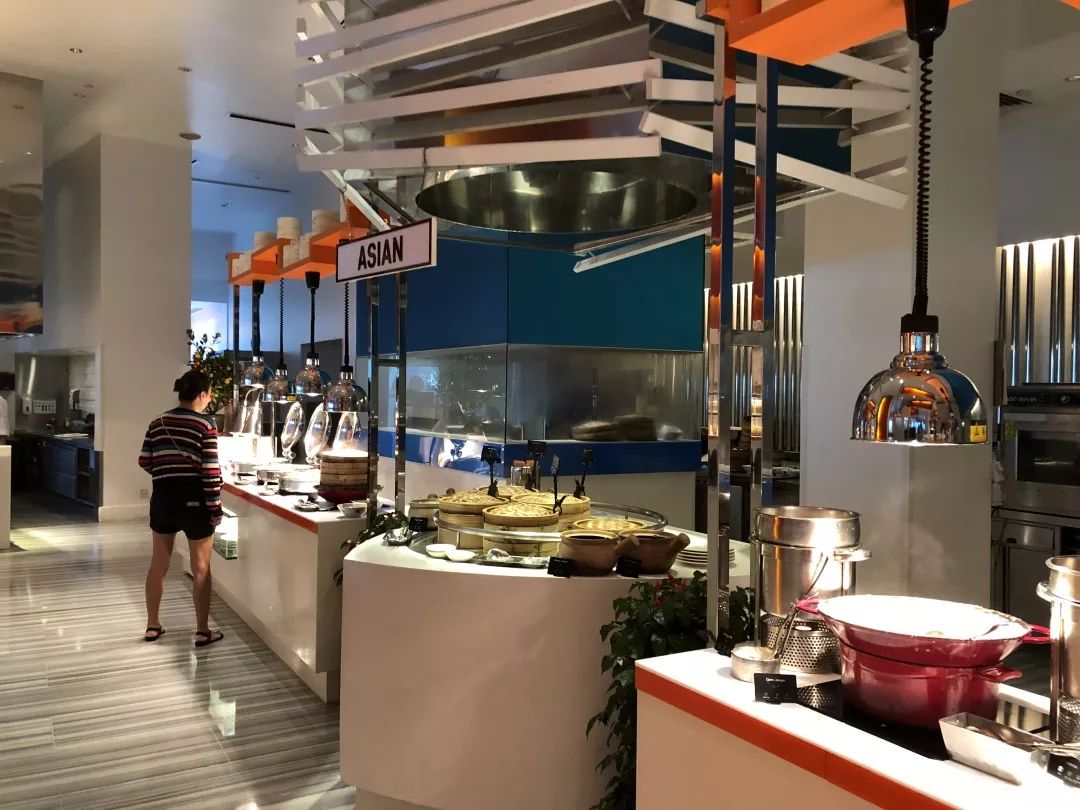 除了自助餐常有的海鲜外,我印象中有新加坡的咖喱螃蟹、还有泰国的绿咖喱、冬阴功、黄咖喱等,还有很正宗的马来西亚的沙爹肉串(超级好吃)等。甜品方面,提拉米苏好吃,是真正放了咖啡酒+意大利手指饼+马斯卡彭芝士做出来的!中餐方面,有叉烧烧鸭这些,还有汤面粉。哦对了,还有一个很赞的,是现煮pasta,可能本鼠吃自助餐太少,没有见过现煮pasta服务的,这里提供!自选意面品种和酱汁,厨师就为你现场烹煮。