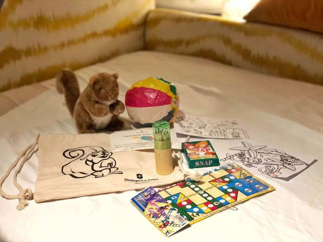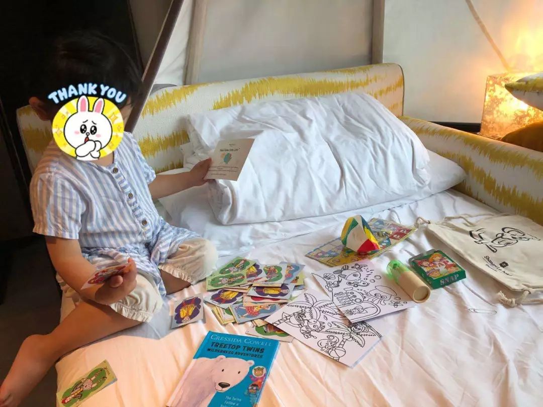 这个pack里面有飞行棋、有小松鼠帆布背囊、彩色笔和填色卡片,填色卡是小朋友画完交给酒店的礼宾部(concierge)他们会安排寄出,其实是一张张明信片!真的很贴心。还有一套游戏卡片(不太会玩)。还有一个吹气的纸球,但很容易撕破。