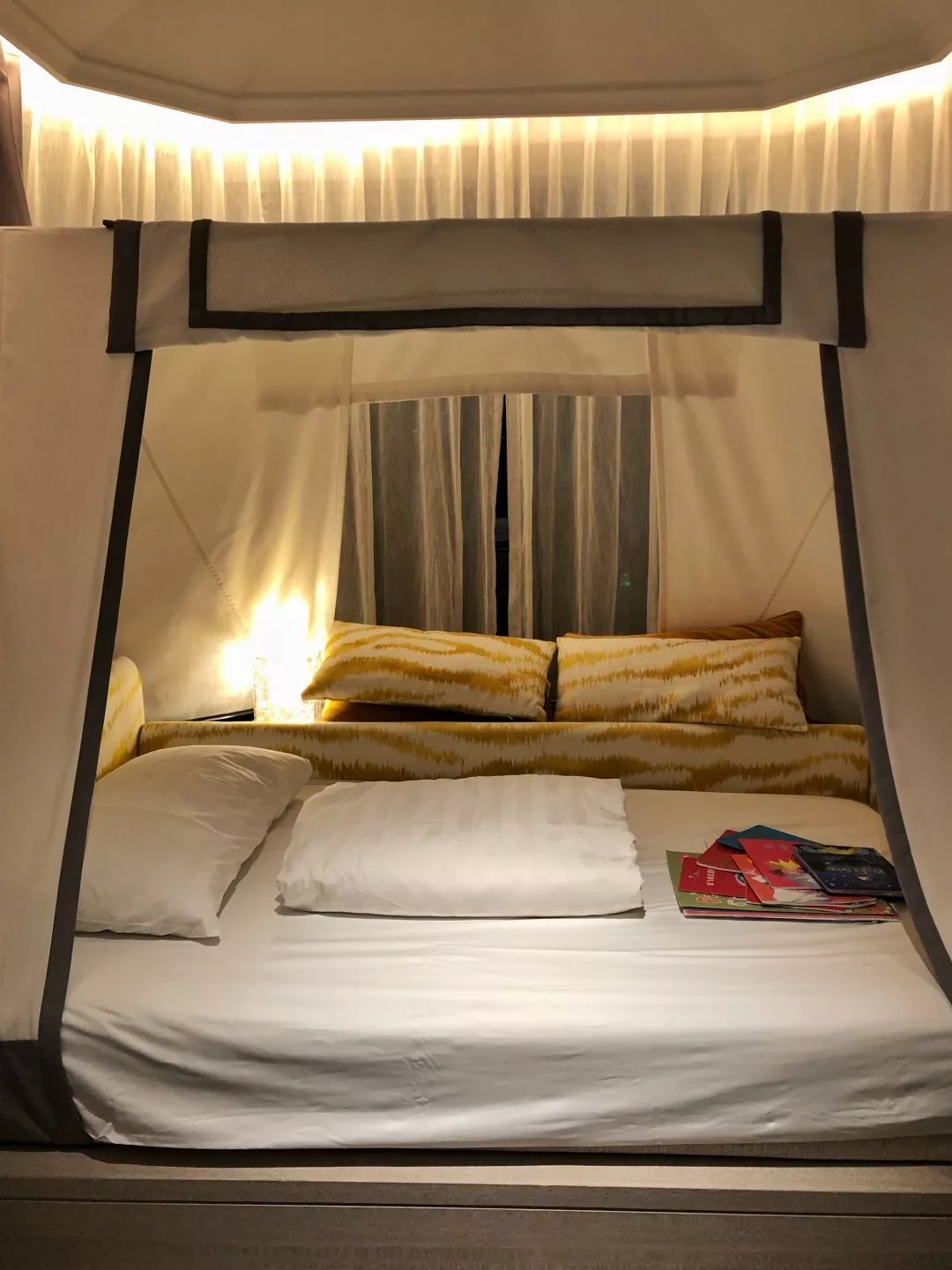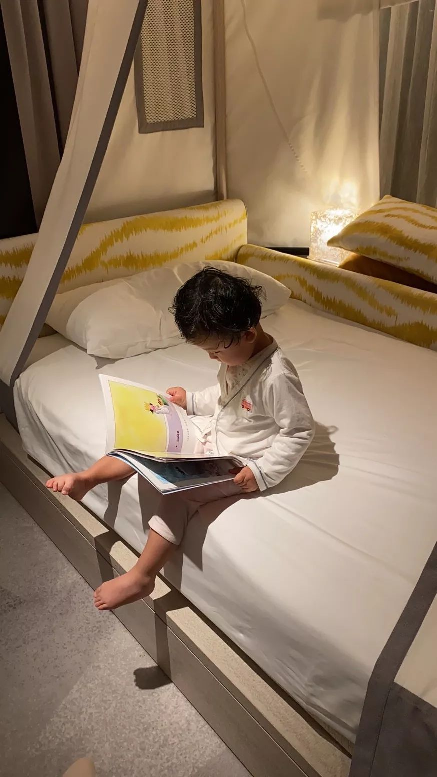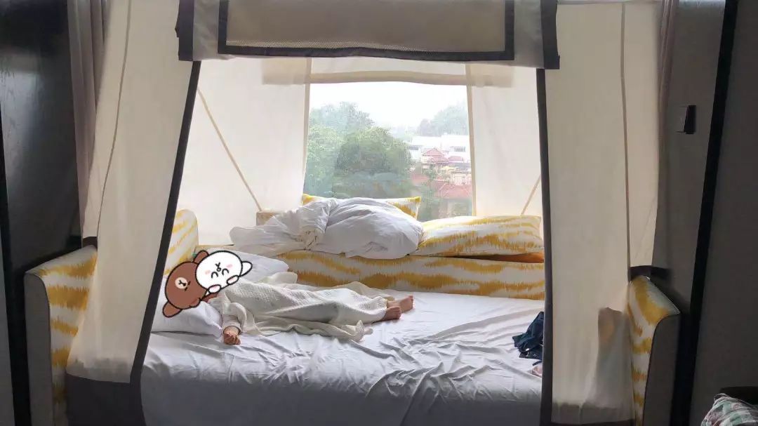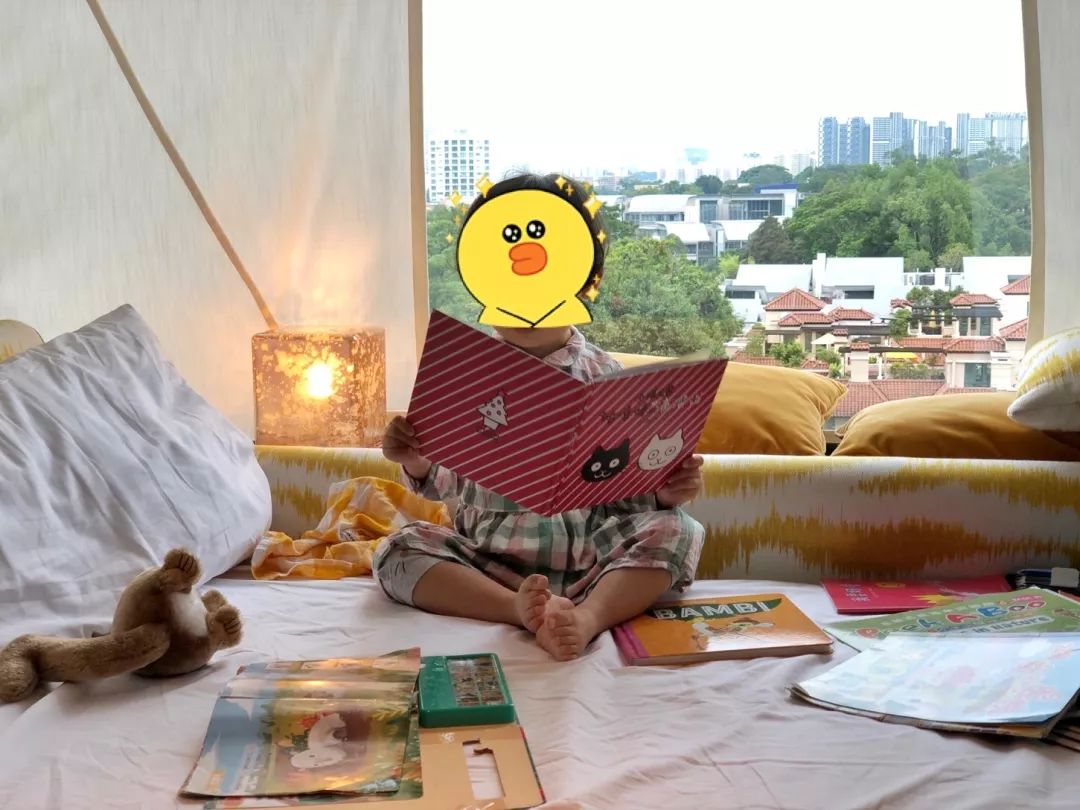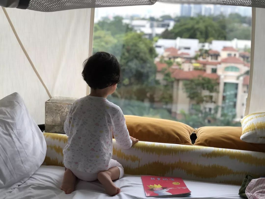 一早起床,小小花栗鼠就要爬到这里看风景,然后是玩游戏、看书;中午还能在这里午睡。真的很好用!而且,小小花栗鼠属于体型比较大的幼儿,1岁10个月已经身高90cm了,所以酒店提供的婴儿床是不适用的。。。小帐篷式的设计还能玩躲猫猫,真的很赞!