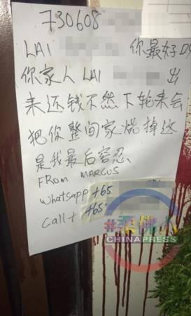 狮城阿窿避债行径猖狂,除了泼漆,还留大字报扬言要烧屋。