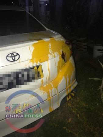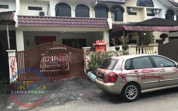 狮城阿窿第二次登门,除了用黄漆泼兄姐的轿车,也泼邻居家的车房墙壁和铁门。