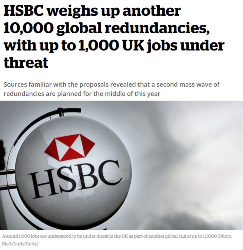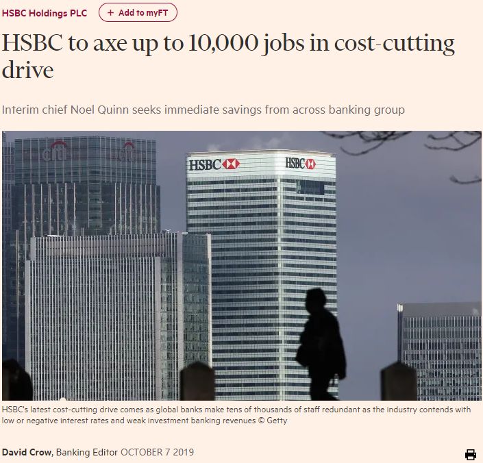 对于HSBC来说,2019着实过得不大太平,先是19年8月份因整体业务调整,全球裁员4700名员工,紧接着又在10月为降低公司运营成本、削减开支,宣布再次全球裁员10,000+。