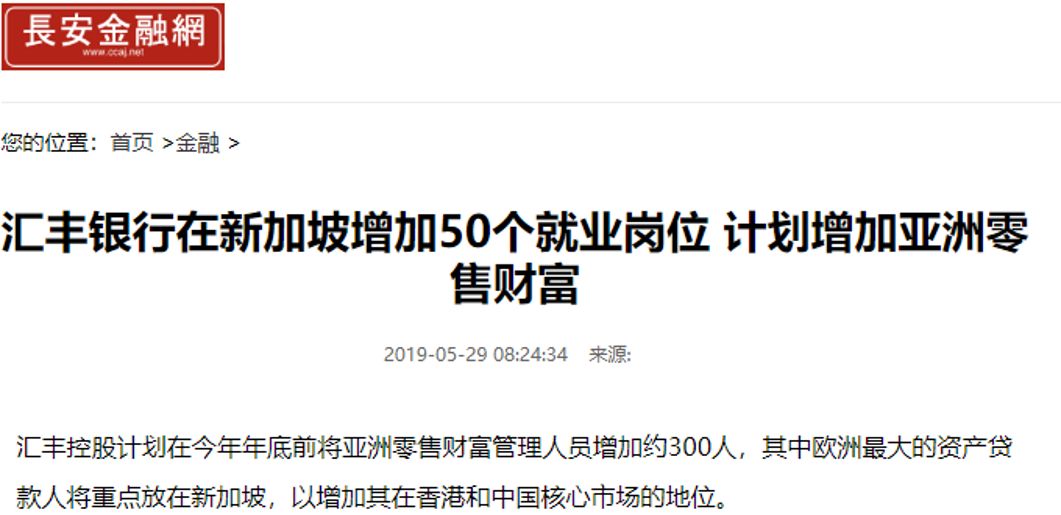 在全球裁员风波不断的2019年,所有人都在担心自己是否能保住饭碗,尤其是投行。但 HSBC 却反其道而行之,在新加坡计划增加50个就业岗位,计划增加亚洲零售财富管理人员增加约300人。
