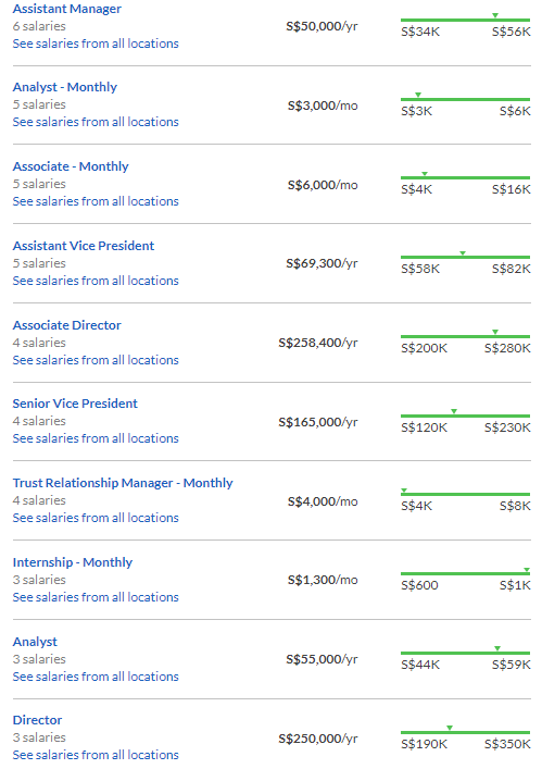 从Glassdoor的数据来看,HSBC在新加坡的相关职位中,Assistant Manager的年薪可以达到50000新币,实习生的月薪也有1300新币,均是在平均水平之上的。