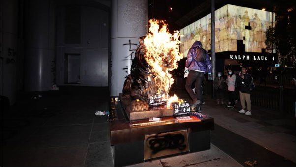 还有人在中环 HSBC 总行的石狮子身上淋上了红色油漆,并涂上红字,到夜晚又淋上易燃液体,再度燃烧……
