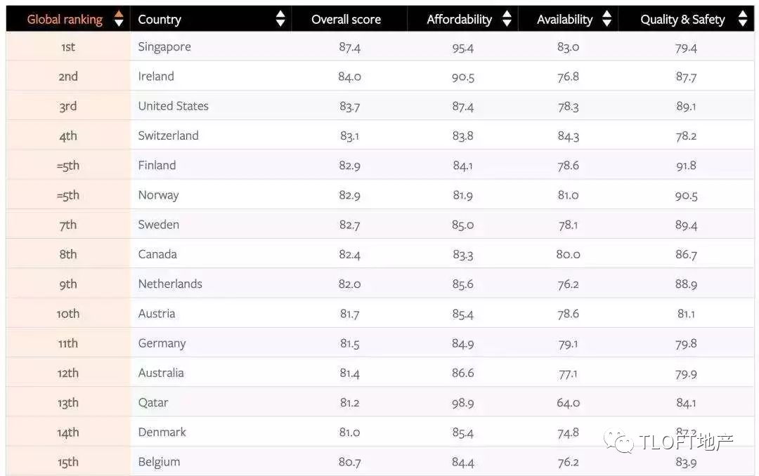 新加坡以87.4分位居榜首,也是名列前20名的唯一一个亚洲国家。