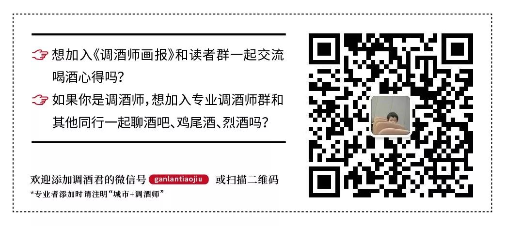 -End-要进群的朋友可以长按下面二维码,或者调酒君微信:ganlantiaojiu(橄榄调酒的拼音),备注是“爱好者”还是“调酒师”,调酒君不是一直在线,但是会经常和大家聊聊的~~“”“”