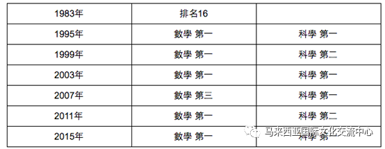 另外,新加坡自1983年开始参加由国际教育成就评估协会(The International Association for the Evaluation of EducationAchievement,简称IEA)主持的学生数学科学能力测评,过去多年的成绩如下:
