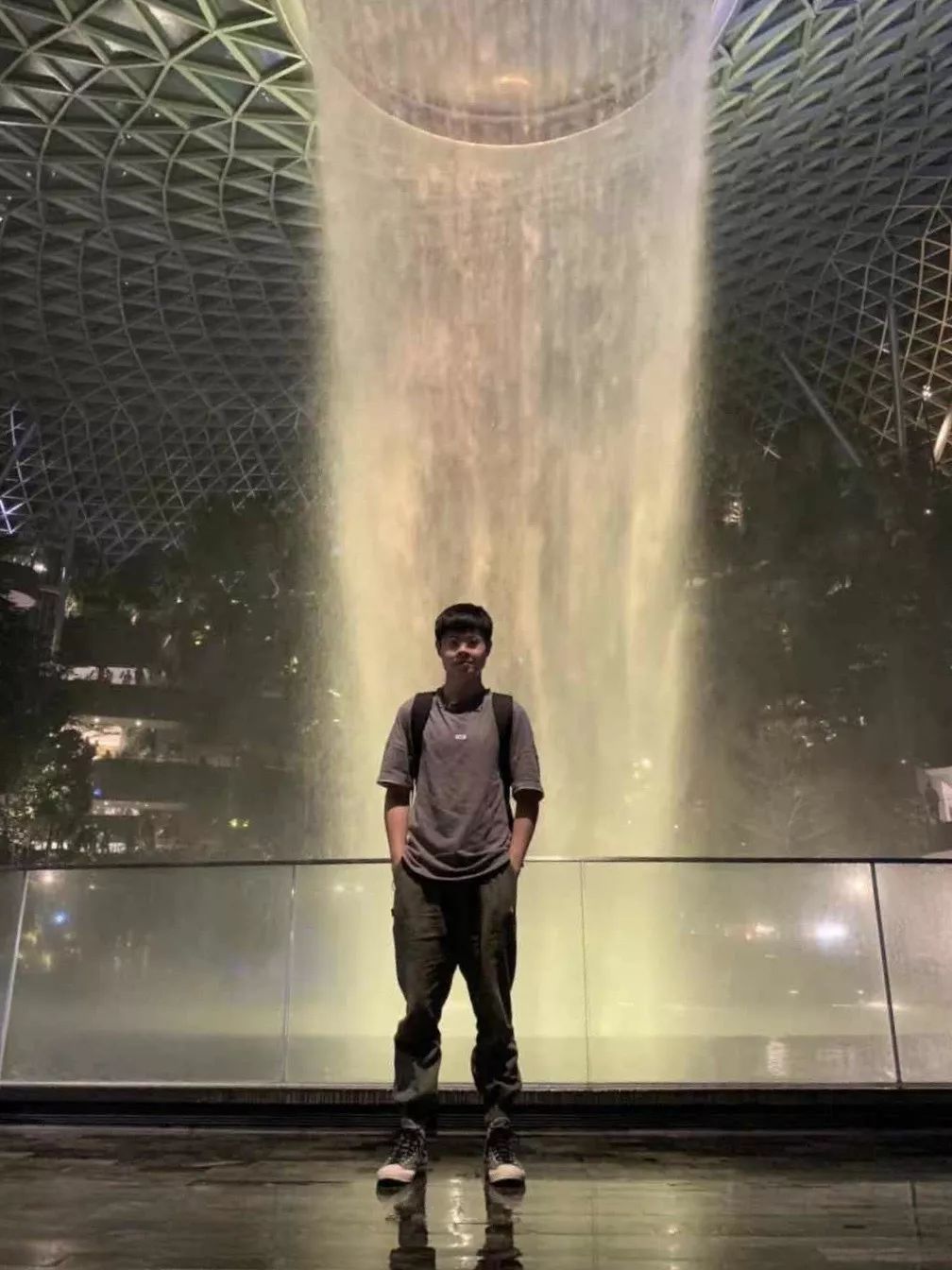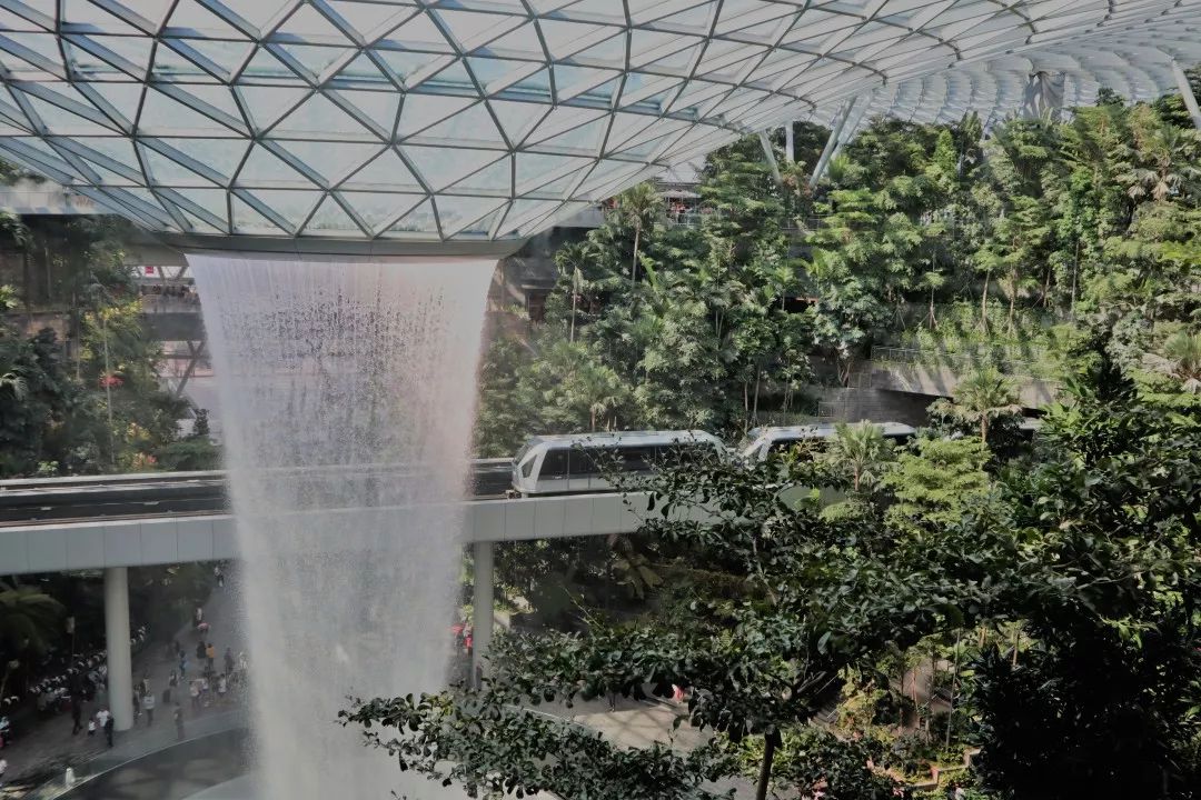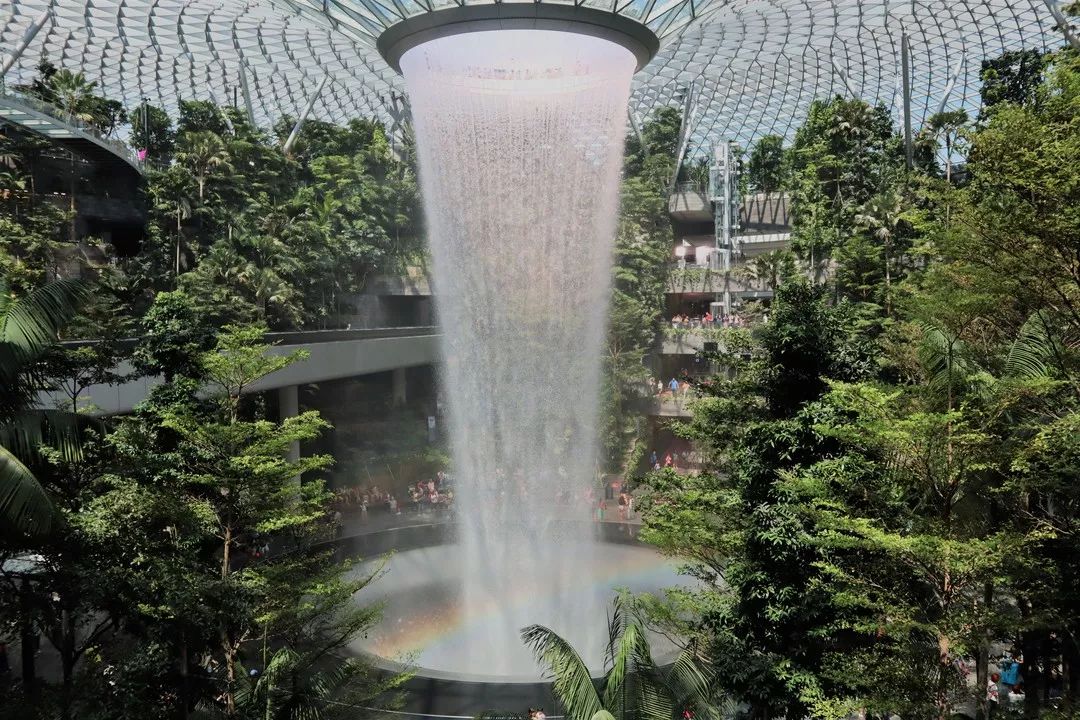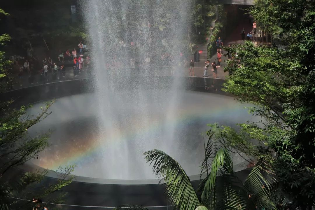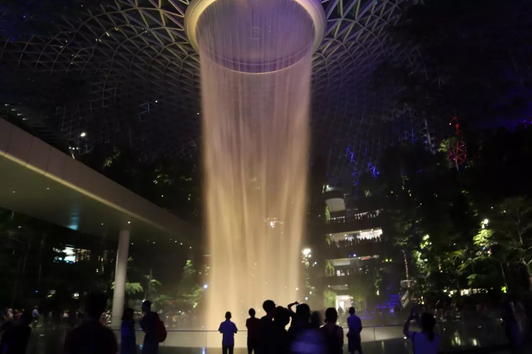 机场内的标志性瀑布是真的好康!夜晚还有灯光秀