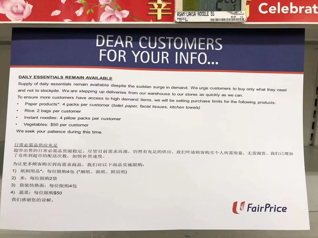 毕竟在橙色警报公布后不久,全岛就刮起了一阵超市抢购风,从大米快熟面罐头干粮到日常生活用厕纸清洁液,无一幸免。这股风潮至今尚未平息,以至于新加坡最大超市,职总总会旗下的平价超市推出了限购令:从2月9日开始,每位顾客最多只可以买四包纸制用品;两袋米,四包快熟面和不超过50元的蔬菜。