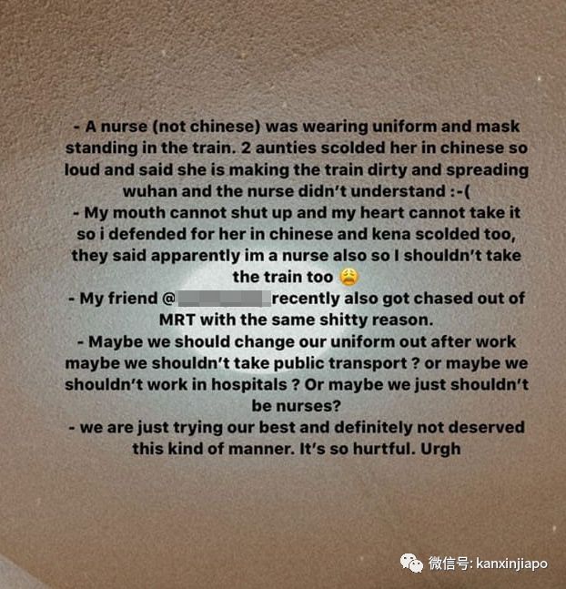 po文的护士这位护士在推特中控诉道,今天(2月11日)早上7点,自己乘搭家中电梯时,另外两名居民也进入电梯。男居民看到她身着制服,立马询问是不是在医院工作。随后便怒斥她,称护士应该走楼梯,为什么还要搭电梯?当电梯打开后,男居民还继续不留情面地说:“你们护士身上总是带着病毒到处走,还总是传染给别人……真是愚蠢!”