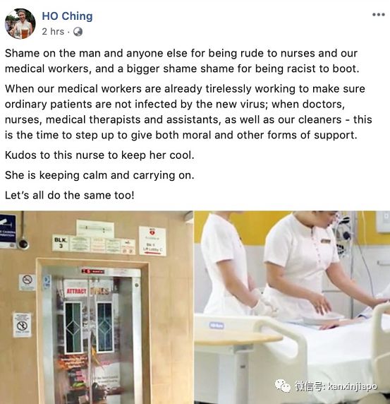 李显龙总理何晶也转发了这则消息,表示为粗鲁对待医护人员的行为感到羞耻,更为歧视行为感到耻辱。医护人员为防治病毒没日没夜努力,他们值得拥有我们各方各面的支持。