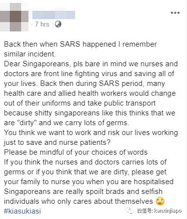 有人发脸书感慨道:”当年SARS发生时,我还记得出现类似情况。亲爱的新加坡人,请记住我们护士和医生时在最前线,并且拼全力拯救你们生命的人。“