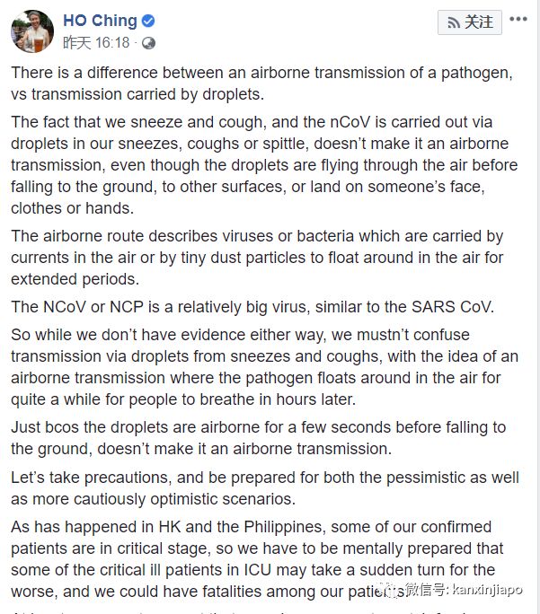 病毒传播途径判断直接影响防疫措施的颁布。李显龙夫人何晶发脸书,亲自科普了“空气传播”与“飞沫传播”的区别。