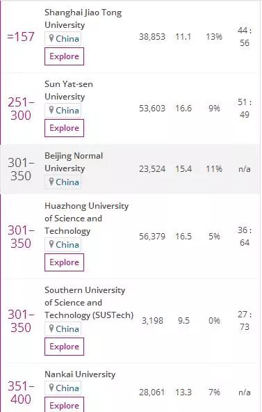 与之对比,排名在201-350的中国大学有中山大学,北京师范大学,华中科技大学,南方科技大学。