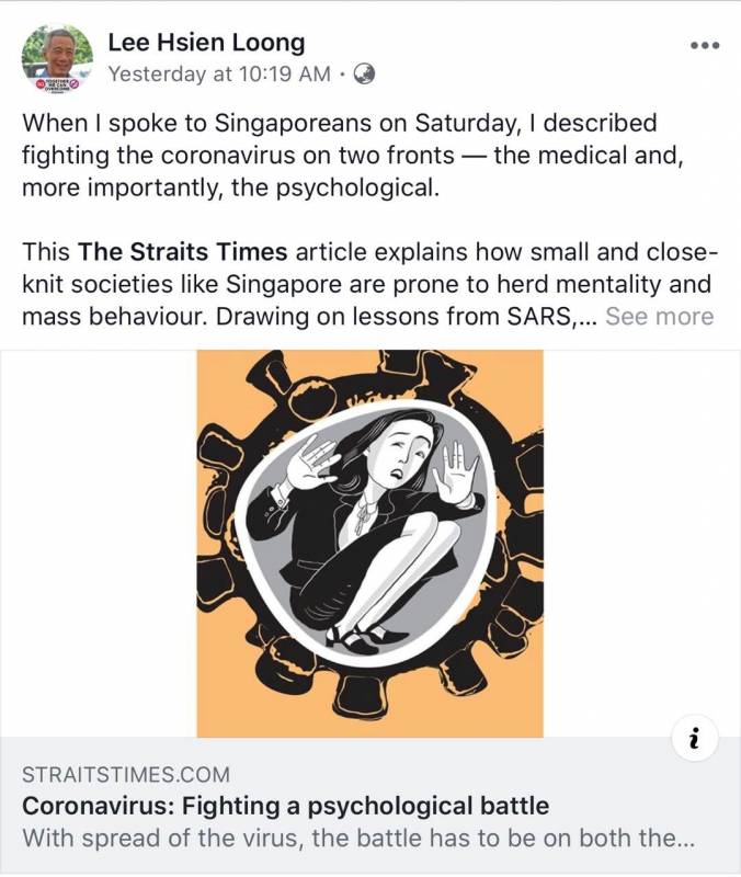 作为一国总理,李显龙先生也做出了民众士气上的鼓舞。昨天,李总理在Facebook上发表了重要讲话,在疫情面前,心理素质更为重要。不要让恐慌淹没良善,团结才是战胜一切的力量。