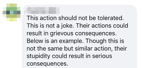 “这种行为简直不能忍。这不是开玩笑。他们的行为可能会造成严重的后果。”