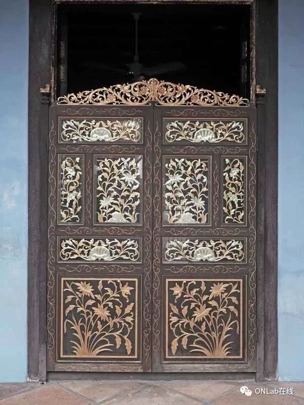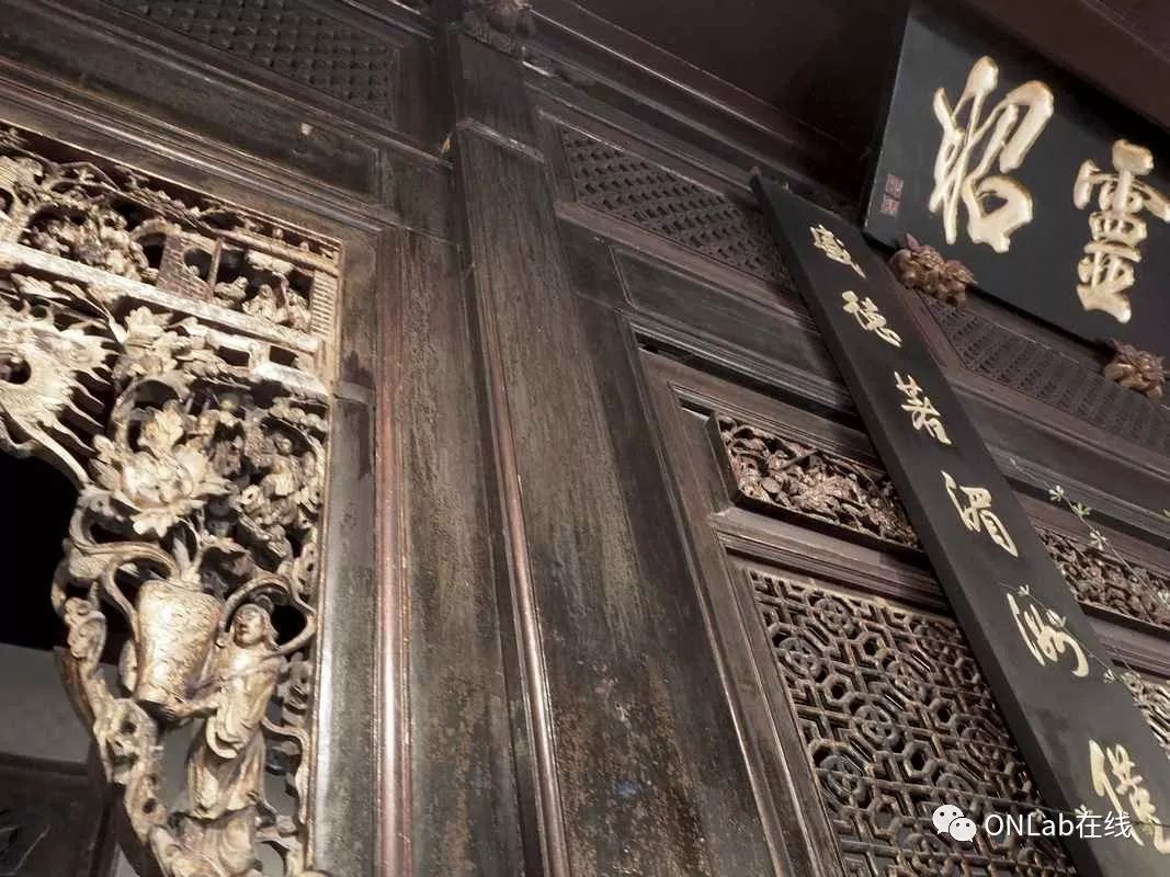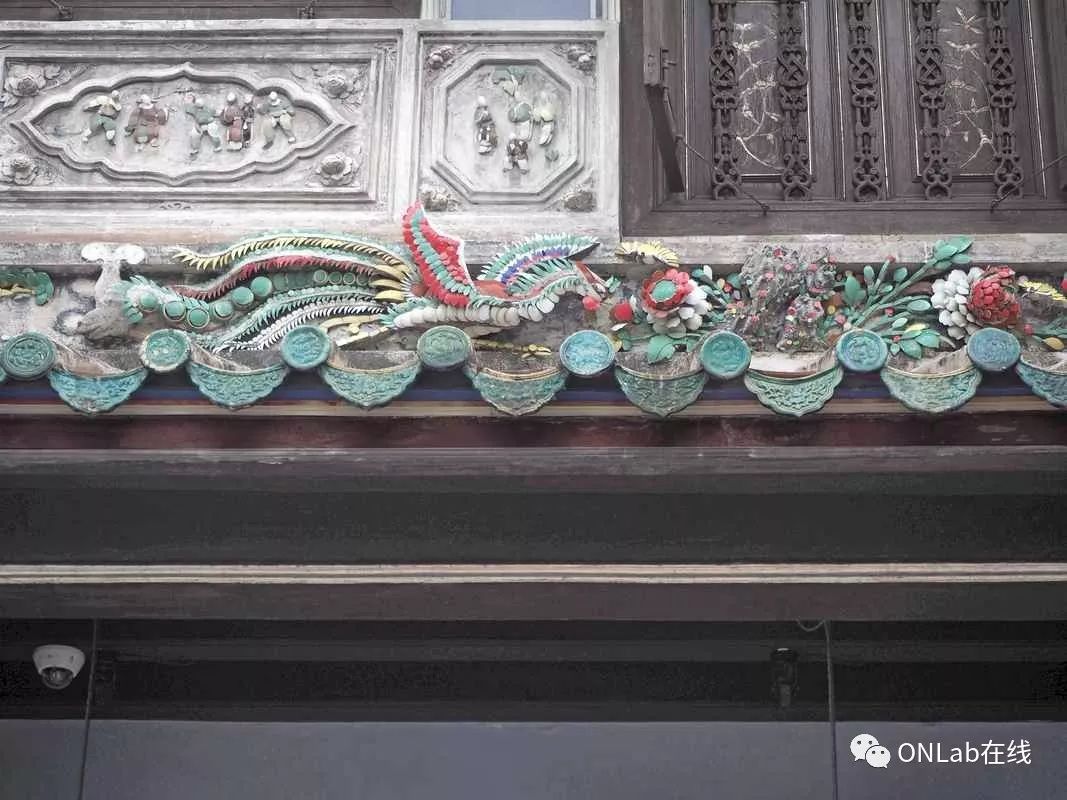 外檐装饰。图片来源:罗裕恒、翁嘉薇。主入口除设有实木通高门扇,外侧设有栅门,廊顶高悬黄家灯笼。接待厅是整栋建筑装饰最为精美之处,正面是华丽的透雕木屏风,遮蔽后部的私人空间。接待厅后沿天井设有木楼梯连接二楼,楼梯下部空间以泥塑与瓷砖围合,形成生动有趣的休息空间。天井采用白色大理石铺地,一侧走道连接到祖厅,正中靠墙摆放着黄家神龛,前设长条餐桌与座椅,两侧墙壁开设壁龛,设有镶嵌玻璃的木门。1950年代,由于殖民政府强制开辟后巷,隔断了原有建筑后部的厨房,黄家因此增建厨房、厕所,以及螺旋楼梯。