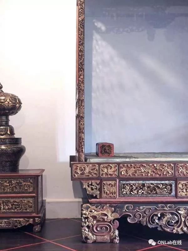 接待厅内精美木雕。图片来源:罗裕恒、翁嘉薇。二楼前部以木板隔出一间房,室内除保留黄家珍贵的婚庆家具,还有大量古董家具及生活用品,展示当年土生华人的生活趣味。掀开地毯,可见地板上的两处孔洞,一处位于接待厅上,一处位于五脚基上,便于观测一层室内外活动。二楼天井一侧是宽敞走道,沿墙摆设座椅。当年整栋建筑只有一间卧室,家人在地板上铺床垫睡觉,空间使用相当灵活。修复时在天井后部空间增加木隔板,围合出一间卧室,放置一套受赠的土生华人家具。峇峇屋改造之后,墙上悬挂不少黄敏家族与陈祯禄家族的历史照片,以纪念这两个土生华人家族,有时不免令人混淆。室内也展示了大量土生华人喜爱的欧洲装饰用品,例如,巨幅墙镜、电唱机、摆件等等,显示出他们对于华族、巫族与西洋文化的多元喜好。