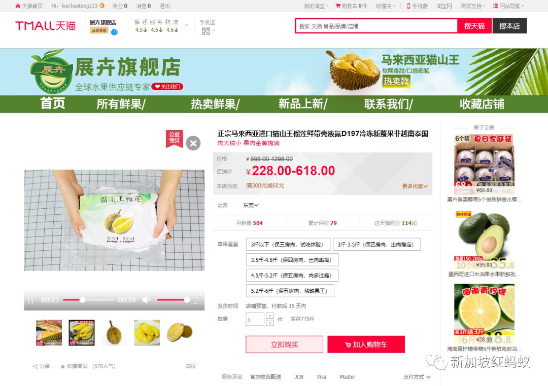 马来西亚榴梿果农宣传猫山王榴梿进军天猫。(互联网)