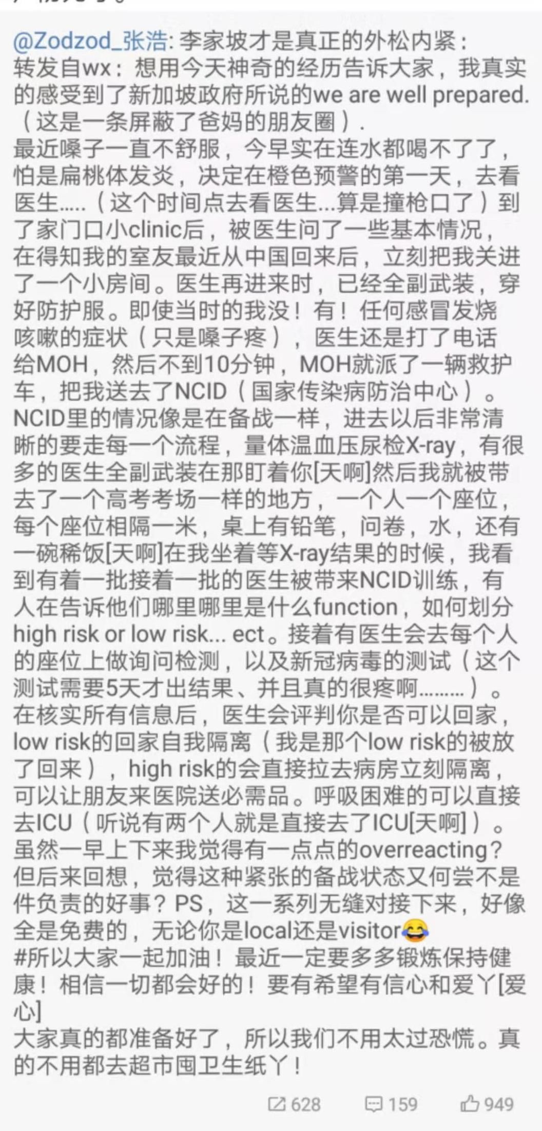 (2月10日中国移民管理局最新的消息) 可以看到,阻断传染源的努力,新加坡早就开始了,并且随着传染源的确诊数增加,加强了隔离程度。 新加坡总理李显龙在全国讲话最后也对个人提出了防疫建议:勤洗手、每天量两次体温、有不舒服马上看医生。 新加坡民众一直对政府的应对能力是有信心的,这建立在一次又一次的重大危机处置上。当年的SARS和2011年的地铁巨大事故,都曾考验过政府在大事件面前的应对能力。 更何况,新加坡的医疗水平之高,全球人民都有目共睹。世界卫生组织在最新的报告《World Health Report》中,对全球各国的医疗体系进行了比较,最后按照预期寿命进行了排名,新加坡排名第三,而中国位列64。 再加上我刚才提到的分诊制,健康人群在家防疫,轻症病人在家庭医生和社区门诊就已经被处理了,重症病人会被送到大型综合医院治疗,极大地避免了医疗资源的挤兑和社会冲突的爆发。 最近,微博上有位网友陈述了他在新加坡的紧张经历。 这位网友起初的症状是嗓子不舒服,去家门口的诊所看医生。当医生得知他的室友最近刚从中国回来后,立刻将他关到了小房间。 很快,是一位全副武装身穿防护服的医生进来询问情况。 十分钟之后,他就被救护车送到了NCID(国家传染病防治中心),开始了一些列的“症状盘问”和检查。