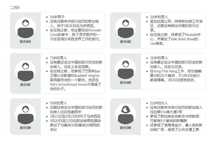 1月23日,新加坡确诊首起新冠肺炎病例,是一名66岁的武汉游客。 随后确诊数开始逐日上升,直到2月4日出现首起本地病例。这个本地患者是中国保健产品商店永泰行的员工。而这间商店的员工及其家人都被一个中国旅行团感染了。因此,这里成为了新加坡第一个爆发新冠疫情的本地集群。 这些信息,我并没有花大力气去挖掘和整理,因为在政府的官网上,可以轻松地查到已经确诊病例的基本身体信息和最近的行踪。
