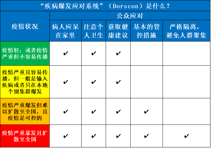 (海峡时报根据公开的信息制作的传播地图) 另外,正因为完全公开的信息,当新加坡君悦酒店因为一场1月份的会议而成为第二个爆发点时,英国政府马上就能确认,一起本地病例来源于此,因为该病人坦白了自己家人参加过这场会议。 透明的信息发布,是新加坡人能“佛系抗疫”的第一大原因。 其次,是新加坡政府建立的“疾病爆发应对系统”(Dorscon)。我在不少文章中都看到作者提到了这个应对系统,但是似乎都对这个系统有点误解。