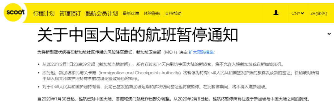 自2020年1月30日起,酷航已对中国大陆、香港和澳门航班作出部分调整。从2020年2月8日起,酷航将暂停所有往返于新加坡与中国大陆之间的航班。