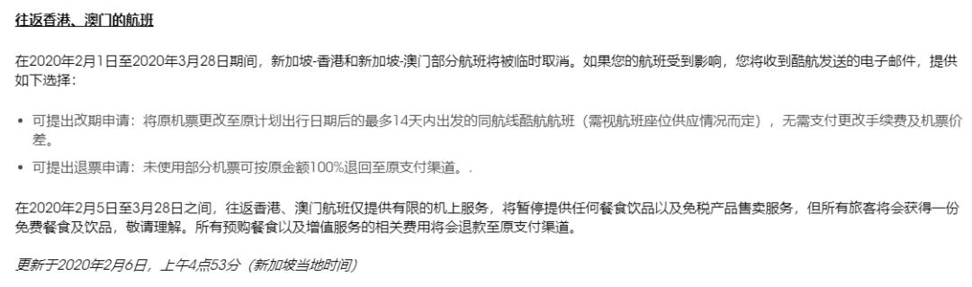 因为新冠肺炎疫情,新加坡多家航空公司发表声明,对旗下往返中国大陆的航班进行调整。有的公司宣布停飞,有的表示会免费为旅客退票、改签。