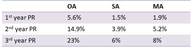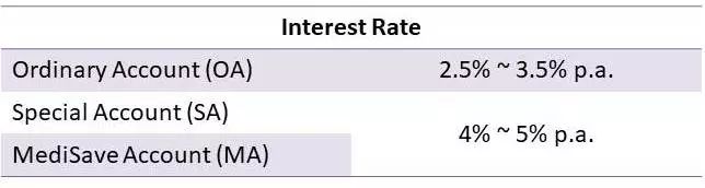 上图为CPF三个账户的年利率的浮动区间。在实际计算中,OA的利息是每个季度审核一次,其利率为法定的2.5%,或该季度内本地银行的平均利率,以较高者为准。以2019年第四季度的OA利率为例,这个季度的OA利率为2.5%,因为该季度本地银行的平均利率为0.64%,是低于2.5%的。需要注意的事,OA账户内的首2万新币会额外享受1%的年化利率。SA和MA的利息也是每个季度审核一次,其利率为法定的4%,或为10年期新加坡政府债券的12个月平均收益率加上1%,以较高者为准。因此,2019年第四季度SA和MA的利率为4%,因为当时的10年期新加坡政府债券的12个月平均收益率加上1%为3.24%,是低于4%的。