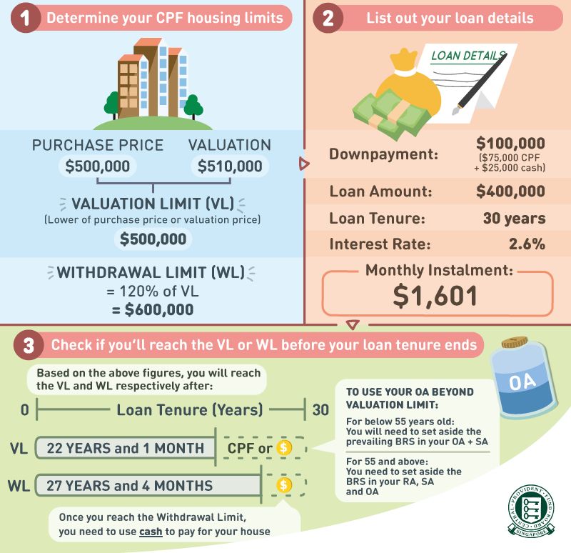 这意味着在22年零1个月后OA偿还的房贷会到达VL,此时需要在CPF内设置好basic retirement scheme,才能继续使用OA还房贷,直到达到WL,之后便不可再用OA还房贷了。