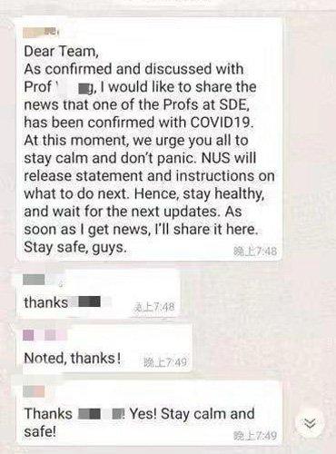 较早前,“我的NUS小助手”报导,国大社交媒体群组昨晚开始疯传一名设计与环境学院系教授感染的消息截图。