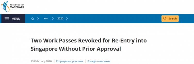 新加坡人力部今天宣布,两名外籍员工因违反新加坡入境规定,被吊销了工作准证,而且永久禁止在新加坡工作!其雇主也被限制1年不得申请外籍员工签证。