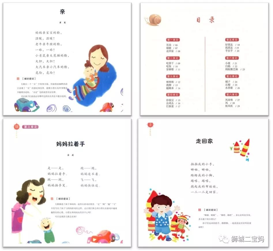 宝妈点评:1). 语言有节奏,有意韵,兼具文学性,艺术性和自然之美;2). 循序渐进,缓坡慢行,不知不觉中,诵读识字。