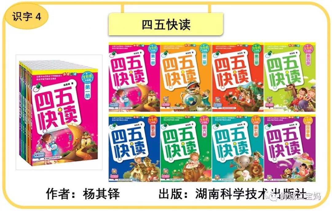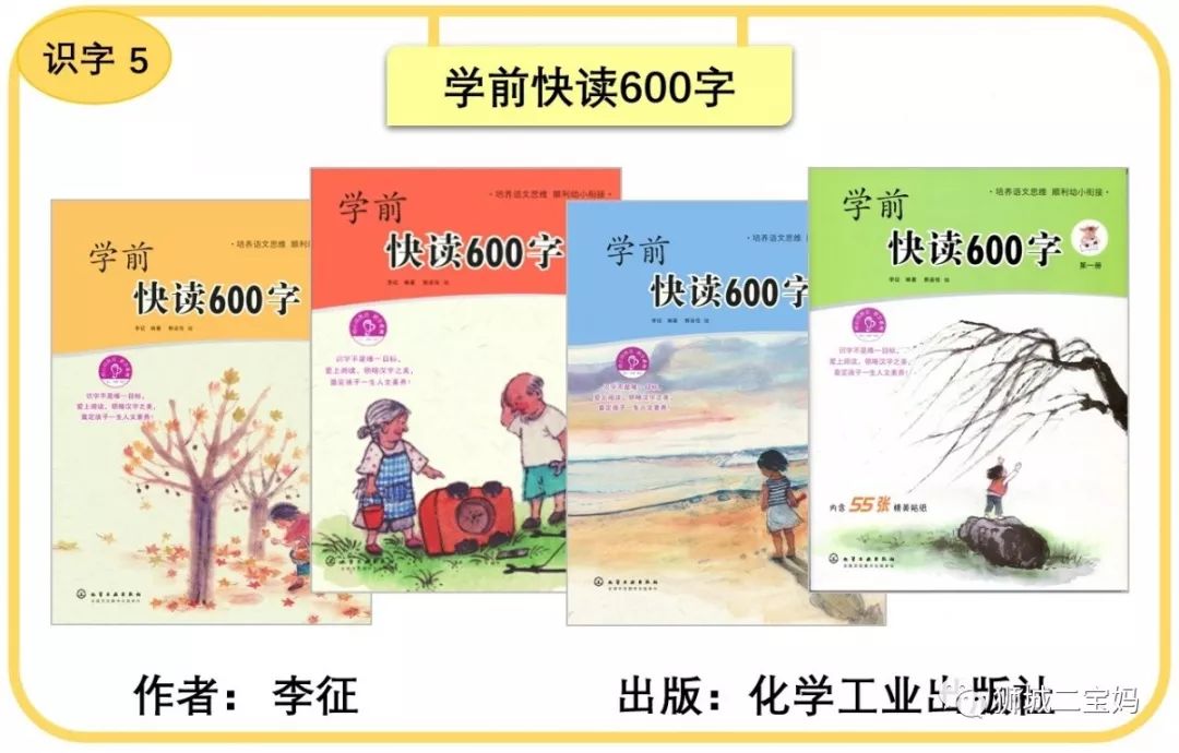 早期教育专家杨其铎老师独创的幼儿快速识字法。全套8册,1-6册共552个生字,第7册字族扩展,第8册童话故事集。边识汉字,边根据已学汉字循序渐进地进入阅读,从符合幼儿认知的词组、句子、段落、短文直至故事,童话。“四五岁就可以识字,认识四五十个汉字就可以开始进入阅读”适读范围:3~7周岁宝妈点评:最畅销的识字教材,但也争议不断。优点:单个汉字灵活组合,反复记忆,短时间快速提升识字量;缺点:枯燥功利,趣味性差,孩子易畏难而半途而废。05学前快读600字