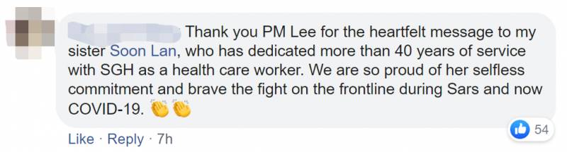 谢谢您李总理给我姐姐走心的留言,她在新加坡中央医院当了40年的护工。SRAS时期和现在她都在前线,我们都为她感到骄傲!