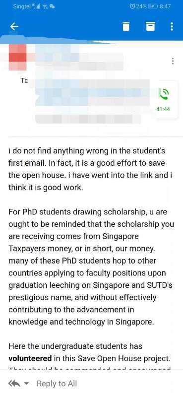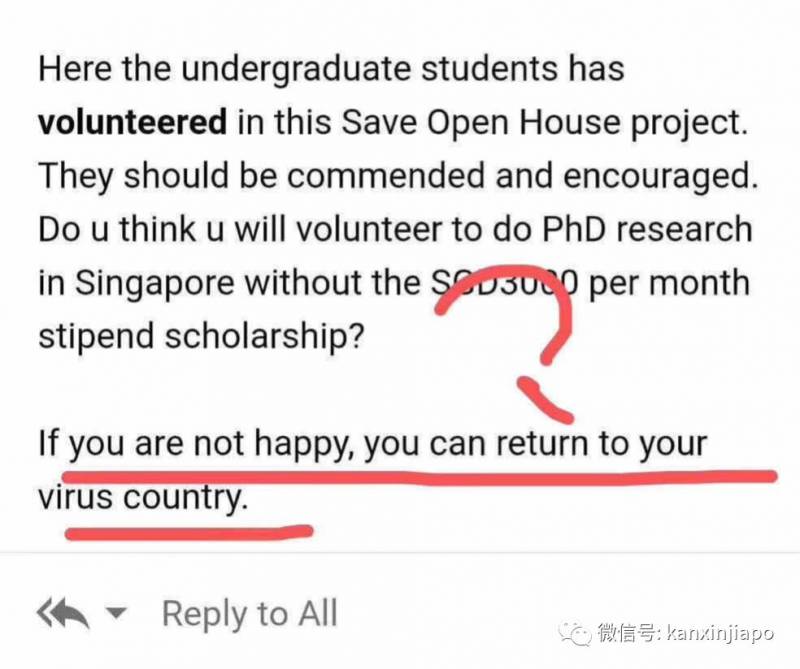 我不认为发第一封邮件的同学有什么错。事实上,这是一个可以让开放日活动继续进行的好方法。邮件里的连结我看了,觉得这个建议可行的。那些领取奖学金的博士生,我要提醒大家,你们的奖学金来自新加坡纳税人的钱,简单说,这是我们的钱。有很多博士生毕业后,会凭借新加坡和SUTD的名声,申请去其他国家的大学教书,对新加坡的知识和科技进步没有做出任何贡献。负责本次活动的本科生都是出于自愿。我们应该支持和鼓励他们。如果没有每月3000新币的奖学金,你认为你自愿在新加坡做科研吗?不爽的话可以回到你的“病毒国家”去。随后,留学生B进行了一番回应,坦言自己的确言辞“有点严厉”,但要求对方诚恳道歉。