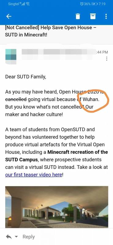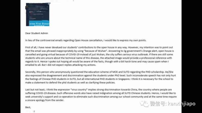 亲爱的学生管理员,针对取消Open House而引发的争论,我有话要说。 第一,我从未以任何方式贬低同学们为Open House做出的贡献。我的目的是指出电子邮件中措辞不当的地方,他用了“由于武汉”这样的表述。我们之所以把Open House换作网络模式,是因为新冠肺炎疫情威胁到新加坡,政府把疫情警报提高到橙色级别,问题出在“新冠病毒”,而不是“武汉”。假如还有同学们不熟悉这个病毒的医学术语,我这里附了张说明图。我说出来,是想让同学们对此有了解。我的语气可能有点严厉,而且我邮件群发给所有人也可能造成骚扰。但我没想到会有后续攻击我的邮件。第二,有人匿名质疑教育部和SUTD的博士奖学金计划。这位同学也表达对这个计划的不支持和对博士生的歧视。这种不为他人着想的言论,不但伤害了SUTD的中国籍同学,还伤害了所有在新加坡读书的国际学生。我觉得学校有必要做出声明,一来保护学生,二来阐明政策。最后,“病毒国家”这个表述对中国有强烈歧视——这个国家的人民还在遭受新冠肺炎病毒的残害。这种冒犯性言论激怒了许多SUTD的中国同学。因此,我要请求校方的支持与合作,消除存在于我们校园的这种歧视,并责令该同学真诚道歉。