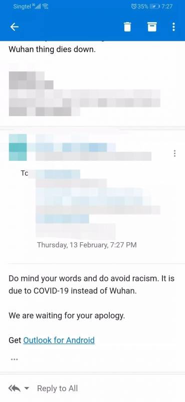 注意你的言辞,不要种族歧视。取消活动是因为“2019新冠肺炎病毒”,不是因为“武汉”。我们在等你道歉。这两封邮件传开后,另一个本地学生C出来发声。C说,领取新加坡政府奖学金来读博士的留学生(包括B),用的都是新加坡纳税人的钱,如果不服,可以回“你们的病毒国家”。