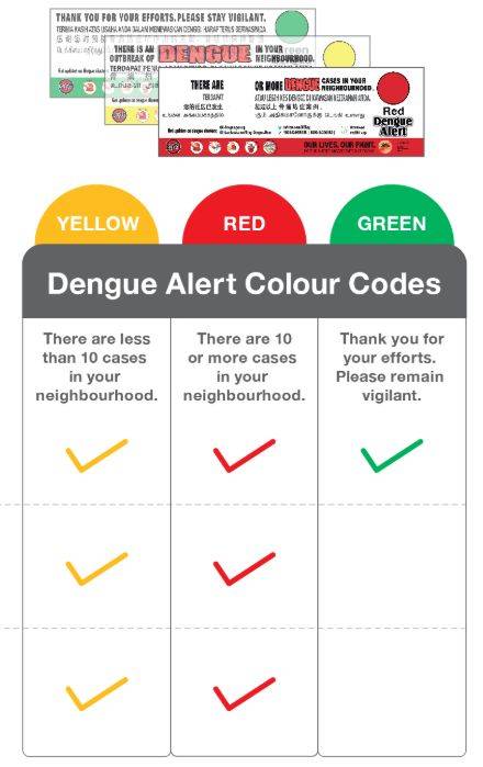 与此同时,环境局也启动了骨痛热社区警报系统,以在骨痛热案例集聚区显示带有颜色编码的标语(黄色,红色或绿色标语),以便及时向居民提供有关本地区骨痛热症信息。