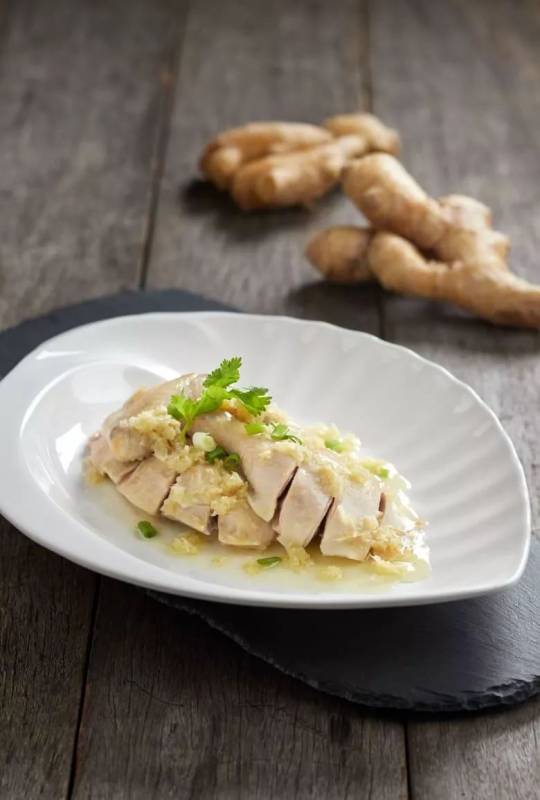 鸡肉搭配姜片一起蒸熟,上桌前再淋上姜蒜酱,让肉质显得更湿润多汁,也是较健康的吃法。